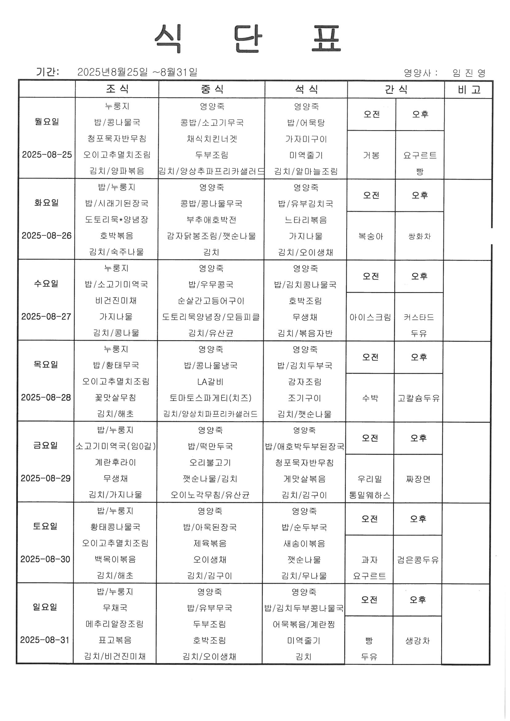 [식단] 25년 8월 4째주 식단표