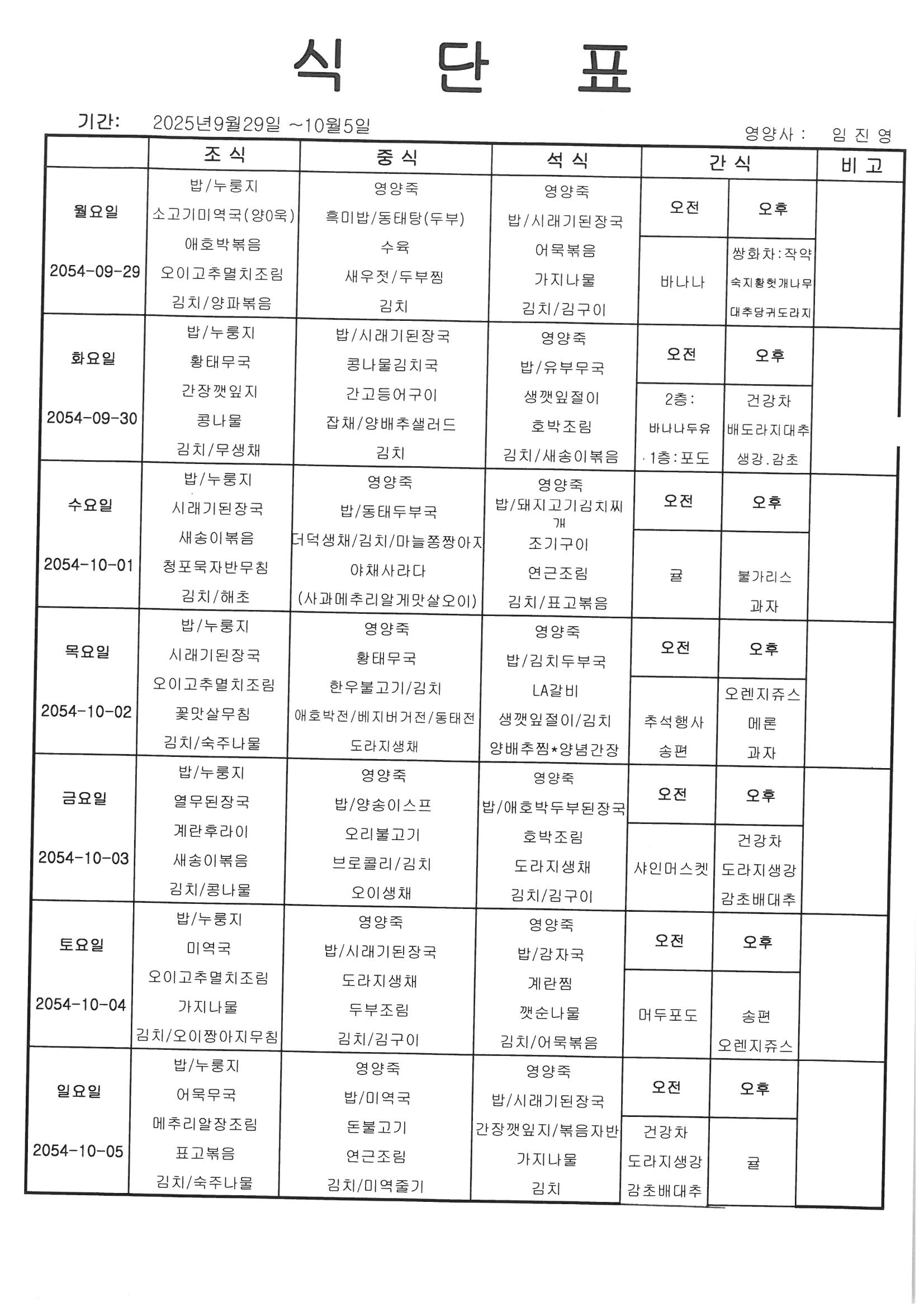 [식단] 25년 10월 1째주 식단표