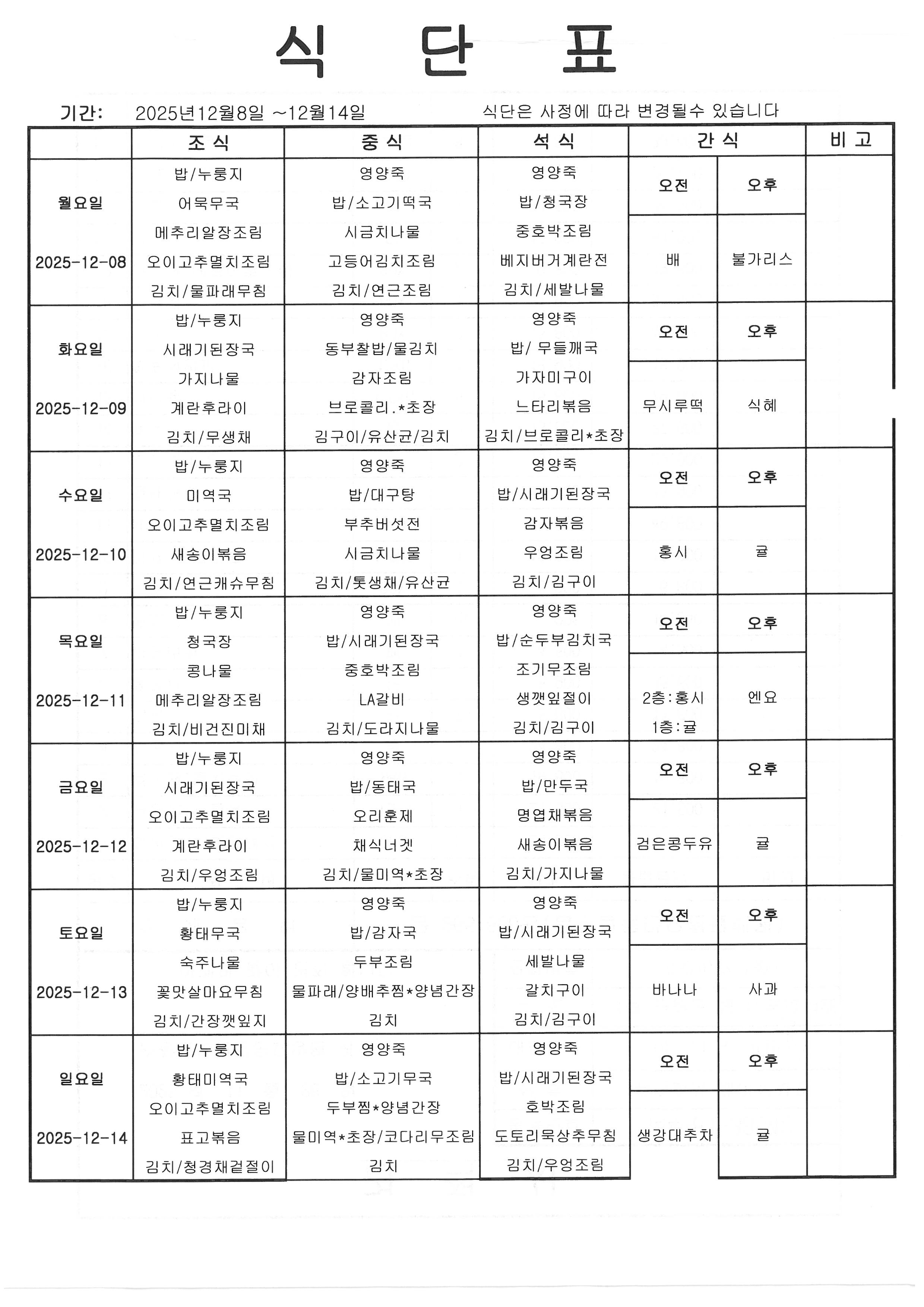 [식단] 25년 12월 2째주 식단표