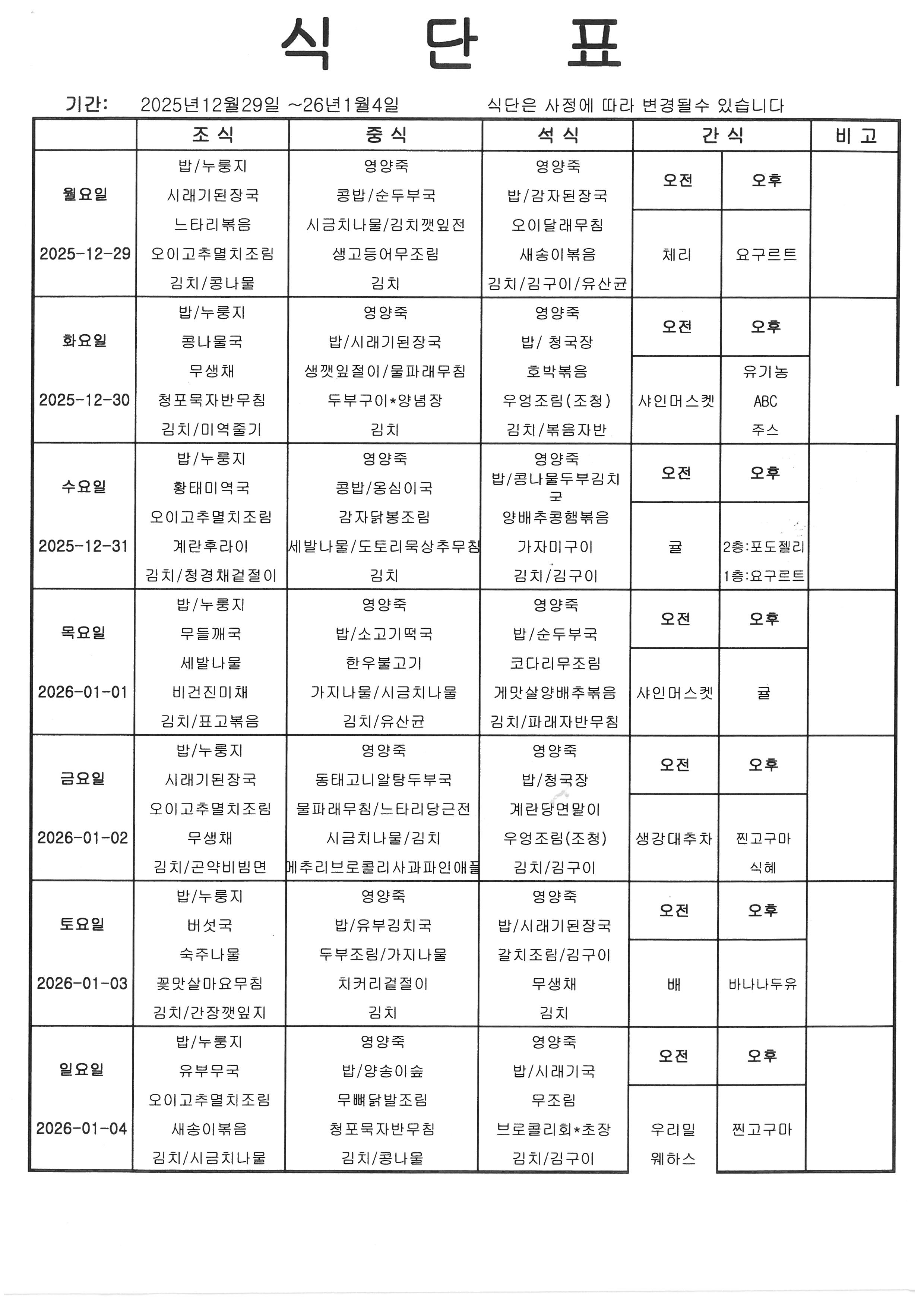[식단] 26년 1월 1째주 식단표