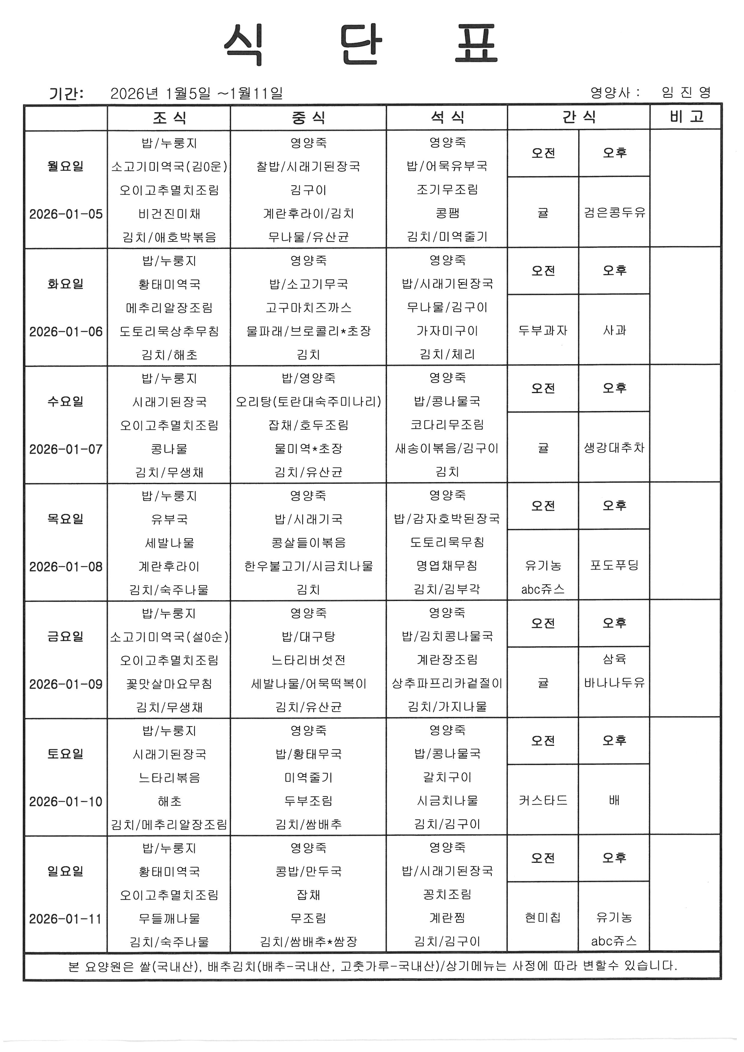 [식단] 26년 1월 2째주 식단표