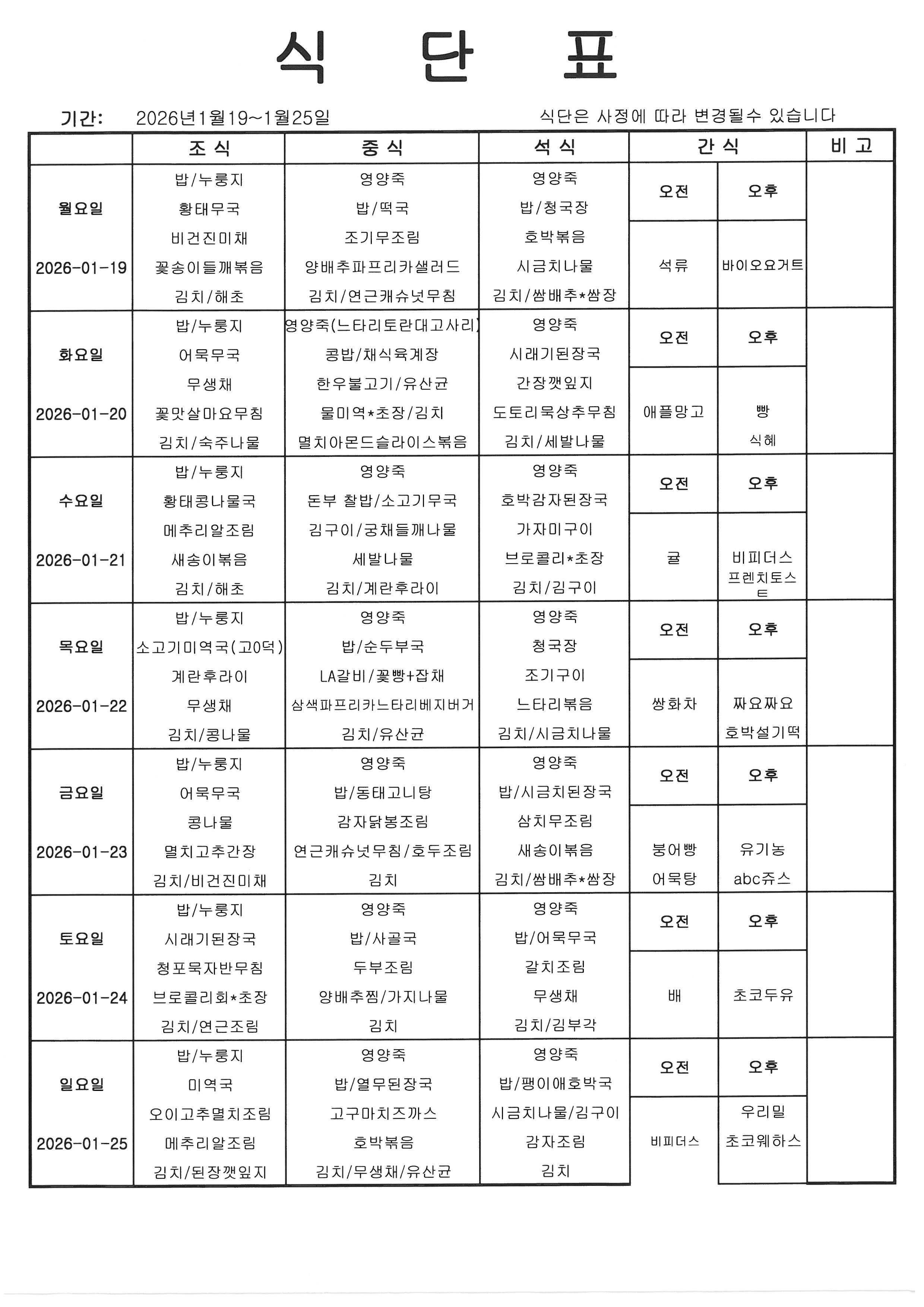 [식단] 26년 1월 4째주 식단표