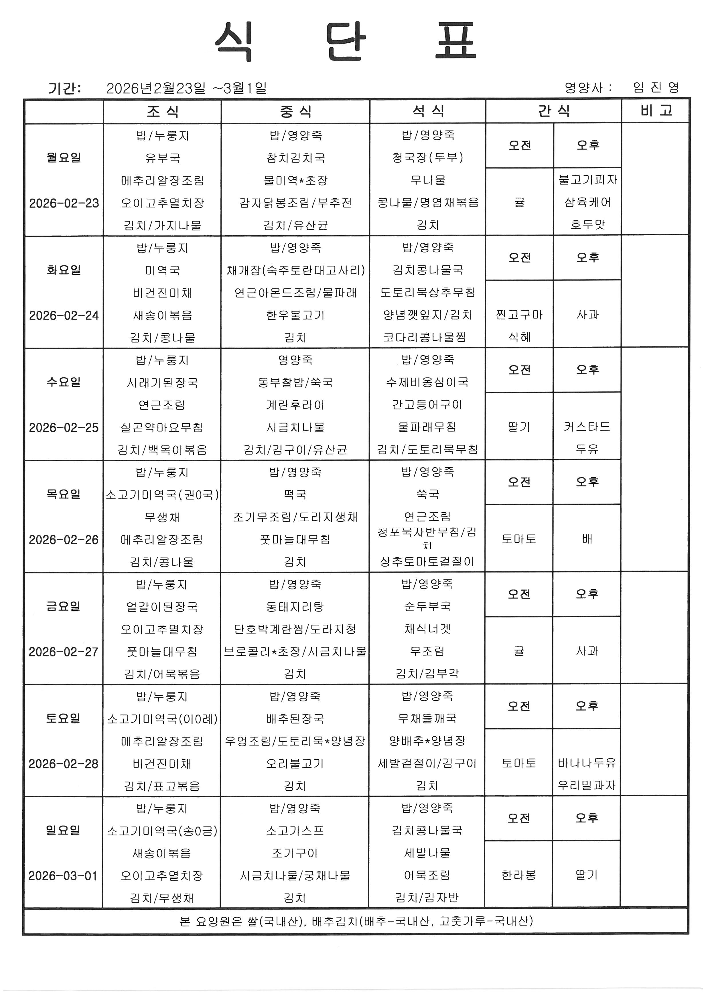[식단] 26년 2월 4째주 식단표