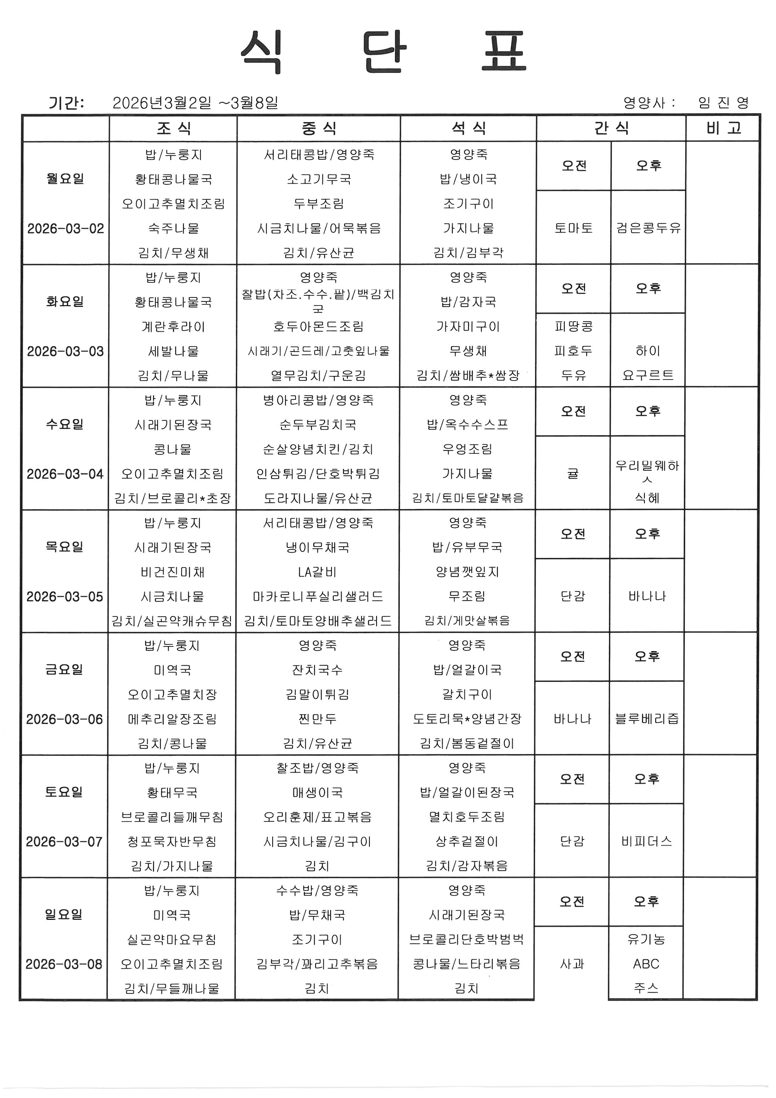 [식단] 26년 3월 1째주 식단표